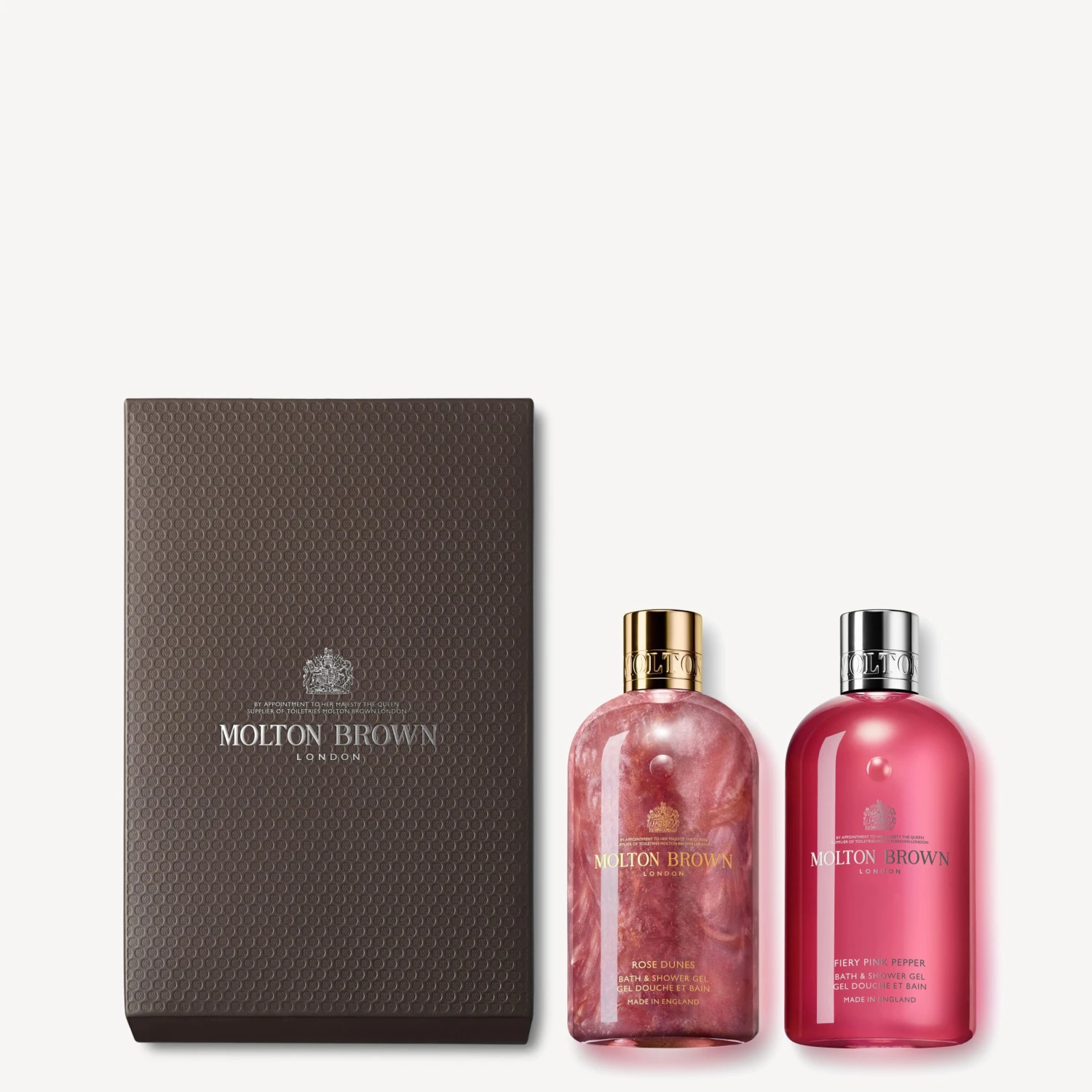 Thoroughly cleanse and richly scent skin with our bestselling, woody-spicy Fiery Pink Pepper body wash decadently paired with the shimmering, ambery Rose Dunes – the perfect gift set to deeply warm the senses.