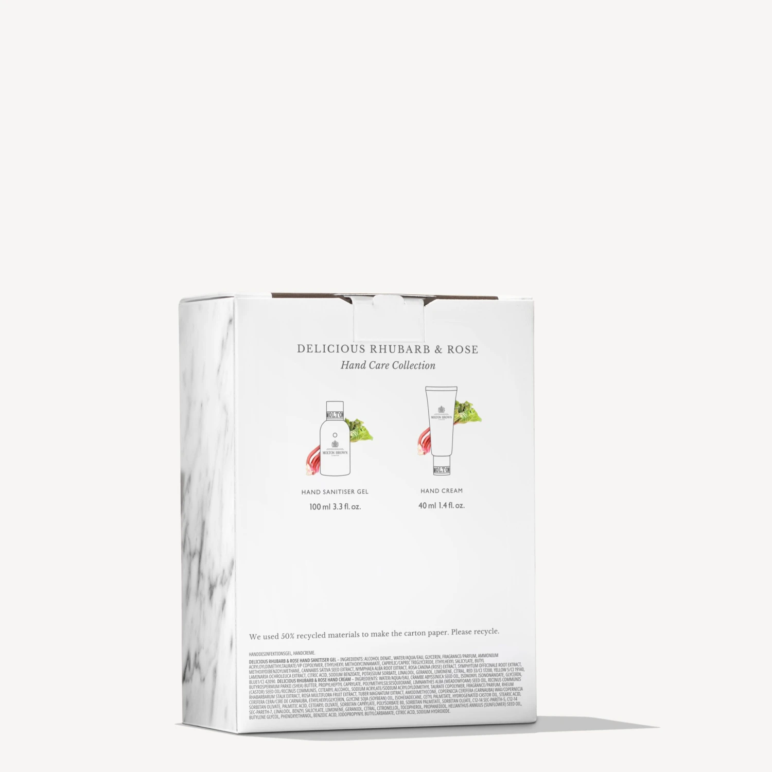 Delicious Rhubarb & Rose Hand Sanitiser : Alcohol Denat., Water/Aqua/Eau, Glycerin, Fragrance/Parfum, Ammonium Acryloyldimethyltaurate/Vp Copolymer, Ethylhexyl Methoxycinnamate, Caprylic/Capric Triglyceride, Ethylhexyl Salicylate, Butyl Methoxydibenzoylmethane, Cannabis Sativa Seed Extract, Nymphaea Alba Root Extract, Rosa Canina (Rose) Extract, Symphytum Officinale Root Extract, Laminaria Ochroleuca Extract, Citric Acid, Sodium Benzoate, Potassium Sorbate, Linalool, Geraniol, Limonene, Citral, Red 33/Ci 17200, Yellow 5/Ci 19140, Blue1/Ci 42090.
