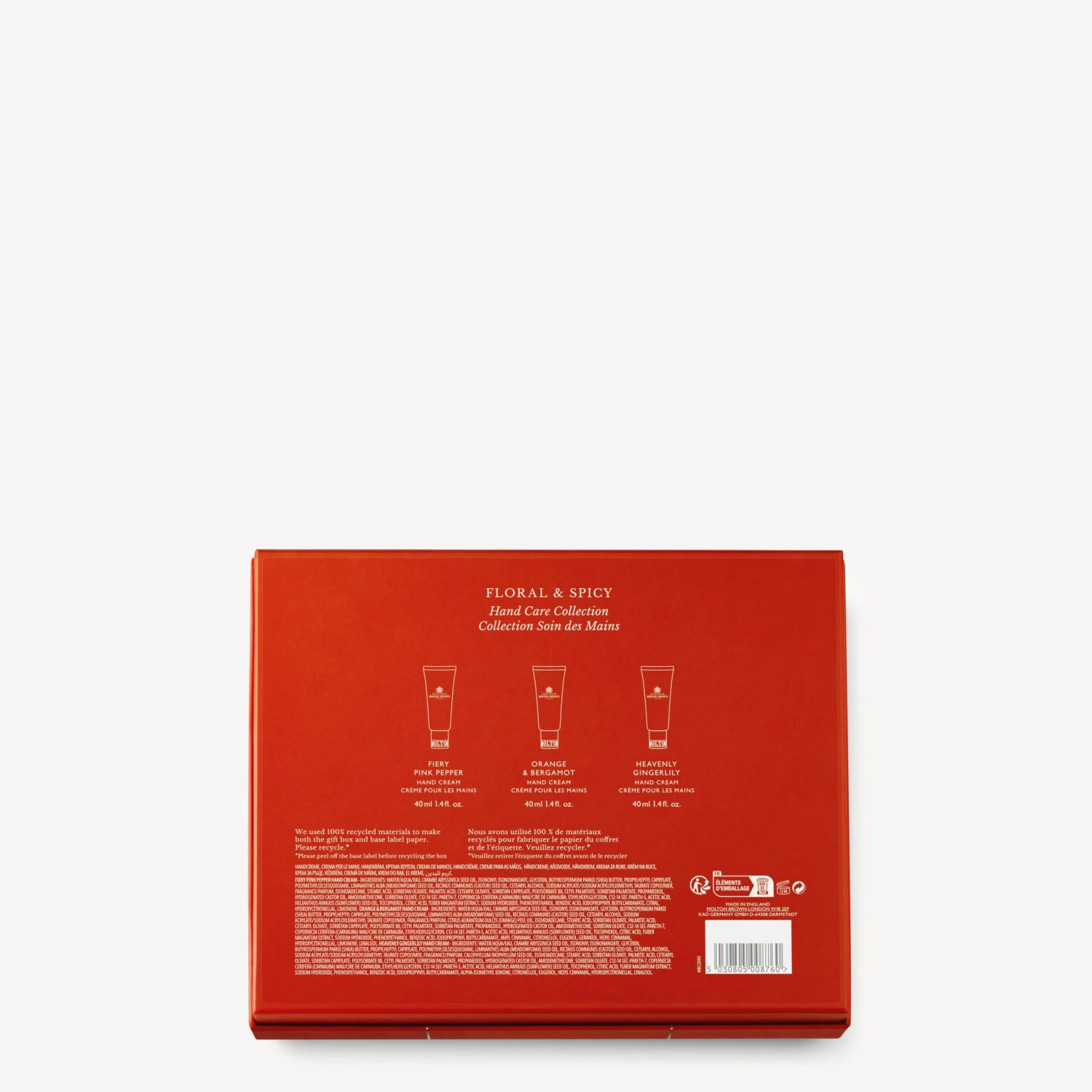 Orange & Bergamot Hand Cream:Water / Aqua / Eau, Crambe Abyssinica Seed Oil, Isononyl Isononanoate, Glycerin, Butyrospermum Parkii (Shea) Butter / Butyrospermum Parkii Butter, Propylheptyl Caprylate, Polymethylsilsesquioxane, Limnanthes Alba (Meadowfoam) Seed Oil, Ricinus Communis (Castor) Seed Oil / Ricinus Communis, Cetearyl Alcohol, Sodium Acrylate/Sodium Acryloyldimethyl Taurate Copolymer, Fragrance / Parfum, Citrus Aurantium Dulcis (Orange) Peel Oil, Tuber Magnatum Extract, Amodimethicone, Glycine Soja (Soybean) Oil, Ethylhexylglycerin, Isohexadecane, Cetyl Palmitate, Copernicia Cerifera (Carnauba) Wax / Copernicia Cerifera Cera / Cire De Carnauba, Stearic Acid, Sorbitan Olivate, Palmitic Acid, Cetearyl Olivate, Polysorbate 80, Sorbitan Palmitate, Hydrogenated Castor Oil, Sorbitan Oleate, C12-14 Sec-Pareth-5, C12-14 Sec-Pareth-7, Limonene, Linalool, Hexyl Cinnamal, Amyl Cinnamal, Hydroxycitronellal, Eugenol, Butylphenyl Methylpropional, Citronellol, Geraniol, Tocopherol, Helianthus Annuus (Sunflower) Seed Oil, Phenoxyethanol, Benzyl Alcohol, Salicylic Acid, Sorbic Acid, Iodopropynyl Butylcarbamate, Citric Acid, Sodium Hydroxide.