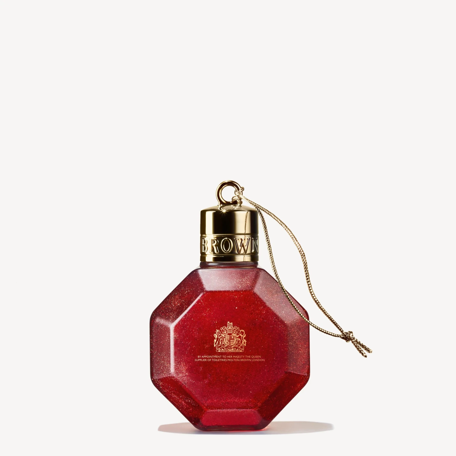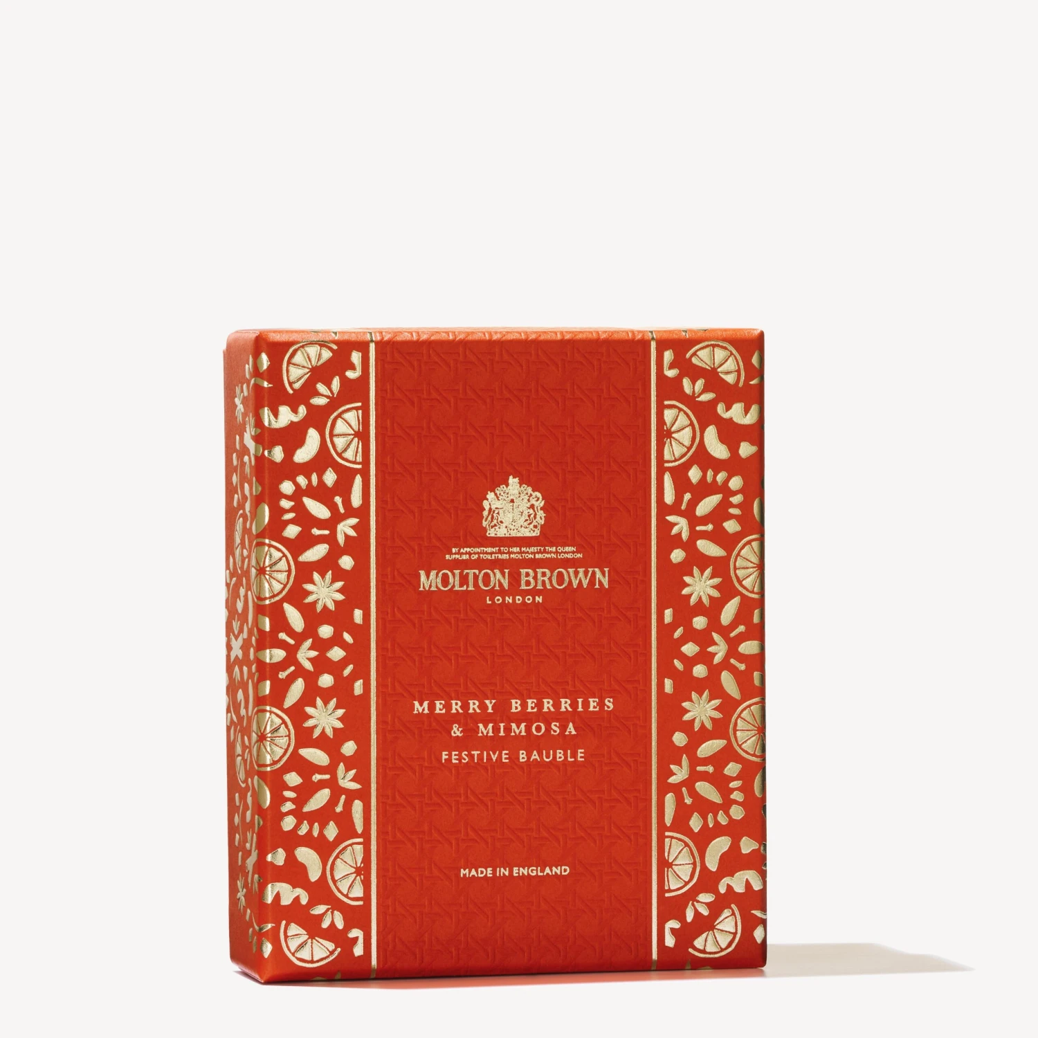 Brimming with red berries, soft mimosa and ripe raspberry, this floral-fruity Christmas bauble is both a glimmering ornament for the tree and a can’t-wait-to-use-it bathing treat.