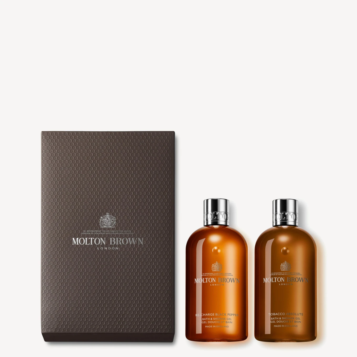 A bathing gift set for the adventurous sophisticate, featuring infusions of Madagascan black pepper and woody tobacco in Re-charge Black Pepper and Tobacco Absolute.