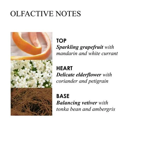 - Notes de cœur : fleur de sureau, coriandre et petitgrain